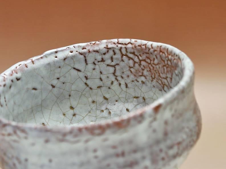 Simply shaped, exceptionally fine matcha tea cup that radiates a very attractive, rather wintry mood. Coarse-grained ceramics with numerous mineral inclusions partly gleaming under glaze, glaze in the thicker areas also with fine crackle and blistering. All in all a very nice modern interpretation of the aesthetic ideal of Wabi and Sabi. The five impressions on the inner floor indicate stacked bowls (no blemish) and a reminiscence of the Korean bowls that are considered models of many Hagi ceramics.