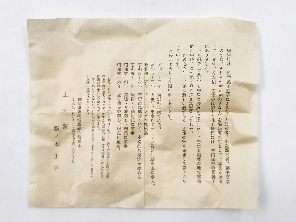 Karatsu Ware Dohei Kiln [Fujinoki Dohei] ``Chosen Karatsu Tea Bowl'' Kirito Box Bookmark Genuine Guarantee